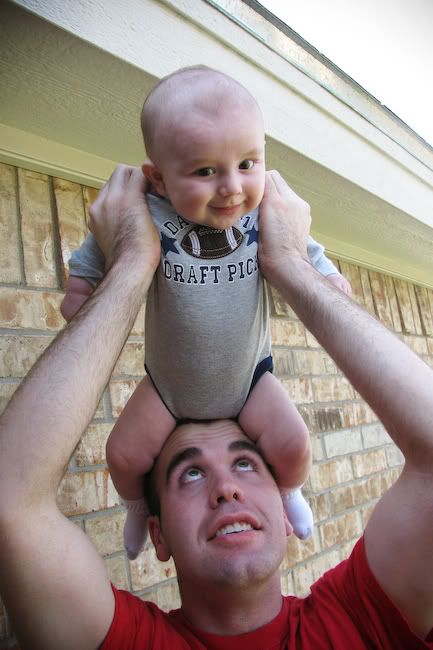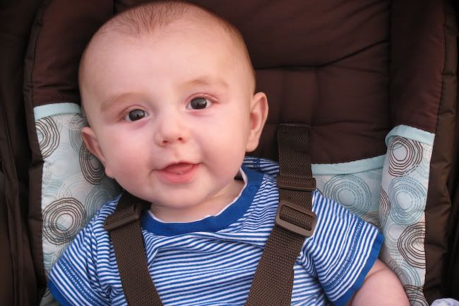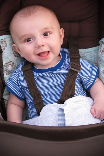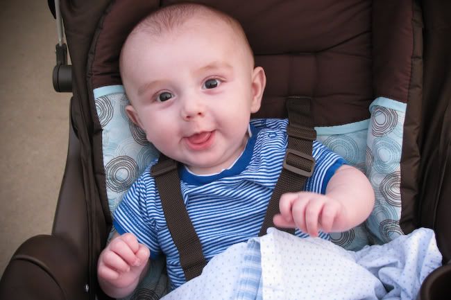 Jackson turned 4 months old Tuesday! :o) Here are some pictures of him with his Daddy and riding in the stroller like a big boy!